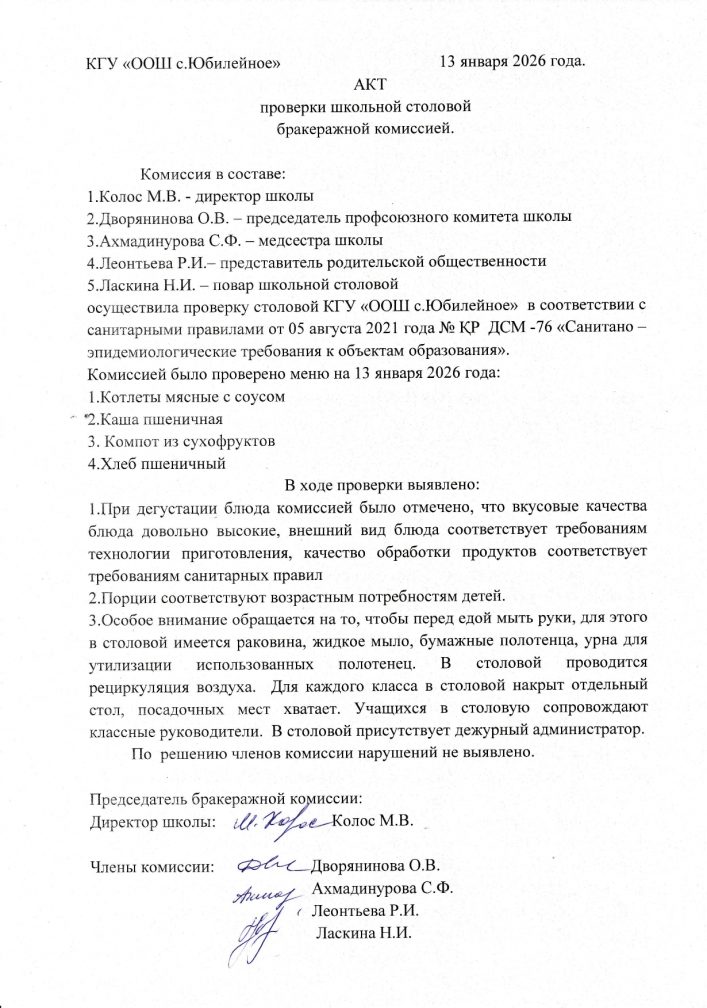 Бракераждық комиссияның мектеп асханасын тексеру актісі