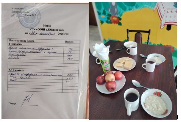 Бүгін аспаз "Достық" сүт ботқасын, май мен ірімшік бутербродтарын, шай мен Алма дайындады.
